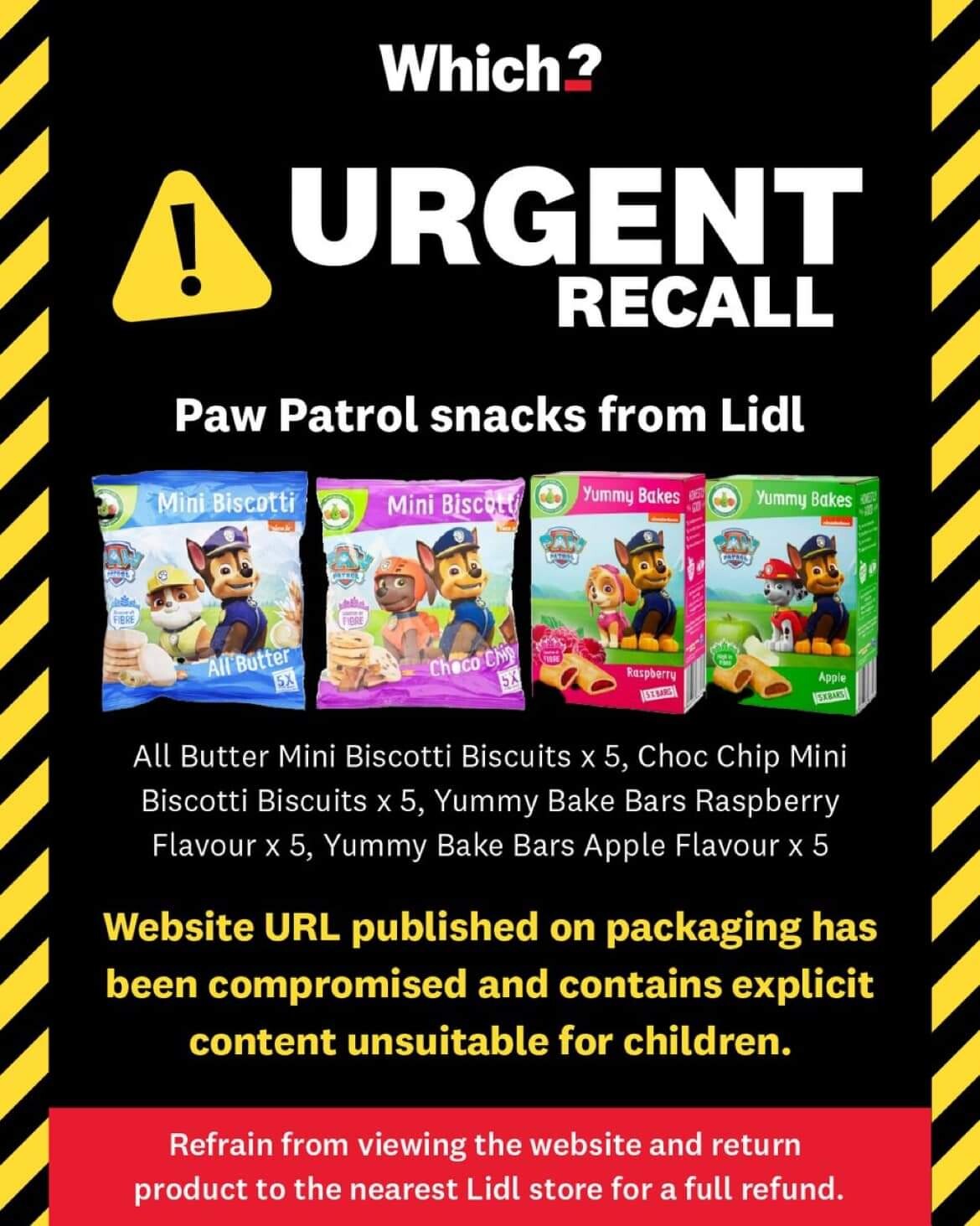 Jedenfalls ist in Großbritannien das gleiche mit Paw-Patrol-Snacks von Lidl passiert. Die Web-Adresse, die auf der Verpackung abgedruckt ist, zeigt jetzt nur noch Pornos an, und darum musste das Produkt zurückgerufen werden.