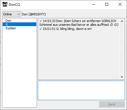 Die GUI ist so rustikal wie es nur geht. In der nächsten Version möchte ich Zeilenumbrüche in Nachrichten erlauben. Gruppenchats und Dateitransfers wären super, aber da brauche ich bestimmt nochmal ein paar Monate …
