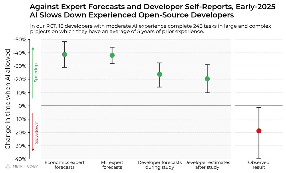 Entwickler denken im Schnitt, dass sie mit KI 20&thisnp;% schneller programmieren könnten. Wirtschaftsexperten schätzen das noch höher ein (ich habe Sex geschrieben, hihihi). In dieser eng kontrollierten Studie hat KI die Entwickler aber um durchschnittlich 20 % ausgebremst, obwohl sie das Gegenteil empfunden haben.